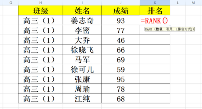 2、首先在旁边的空白单元格里输入一个等于号以及rank函数,接着可以看到此函数有三个参数。