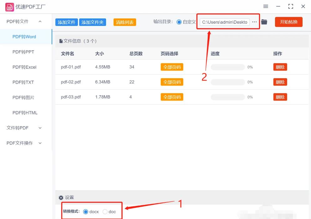 3、选择转换后的word文件格式(docx或doc),然后设置输出目录文件夹。