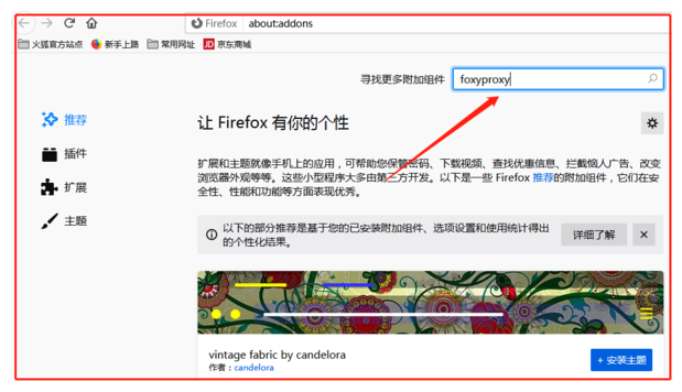2、然后打开火狐浏览器的插件中心。3、随后在搜索框中搜索FoxyProxy。