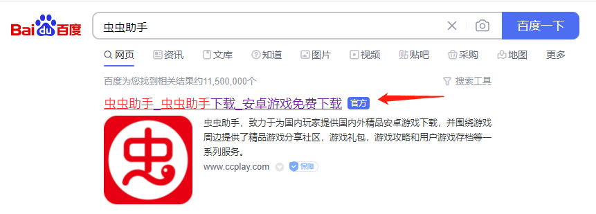 1、首先在浏览器中搜索虫虫助手,然后选择进入带有“官方”字样的网站链接。