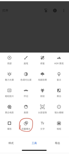 3.打开图片点一下下方的工具按钮后从众多工具中选择“双重曝光”。