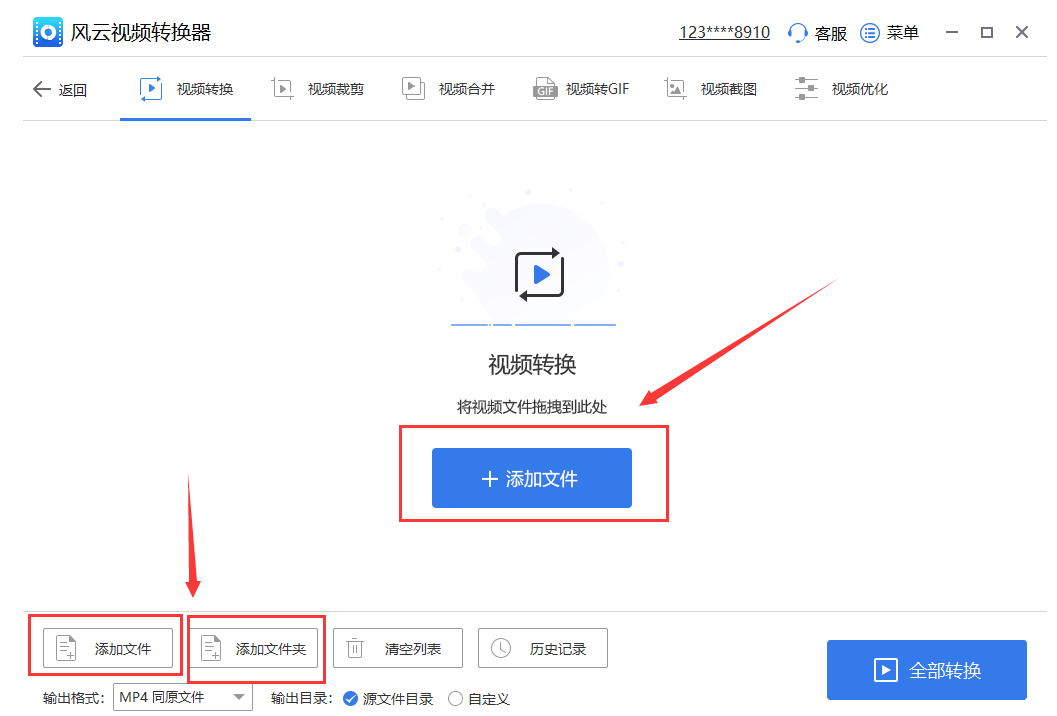 2、进入视频转换页面后,点击“添加文件”按钮,也可以将需要转换的B站视频文件直接拖拽到列表里,若需要添加多个视频转换的话可点击添加文件夹。