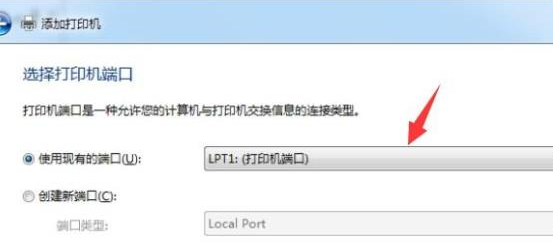 4、然后选择使用现有的端口:LPT1:(打印机端口)。
