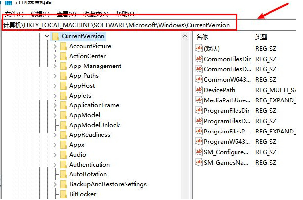 4、在打开的注册表编辑器中复制路径“计算机\HKEY_LOCAL_MACHINE\SOFTWARE\Microsoft\Windows\CurrentVersion”,按下回车键即可;