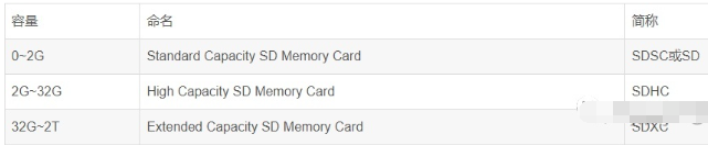 SD卡按容量分类,可以分为3类:SD卡、SDHC卡、SDXC卡,如下: