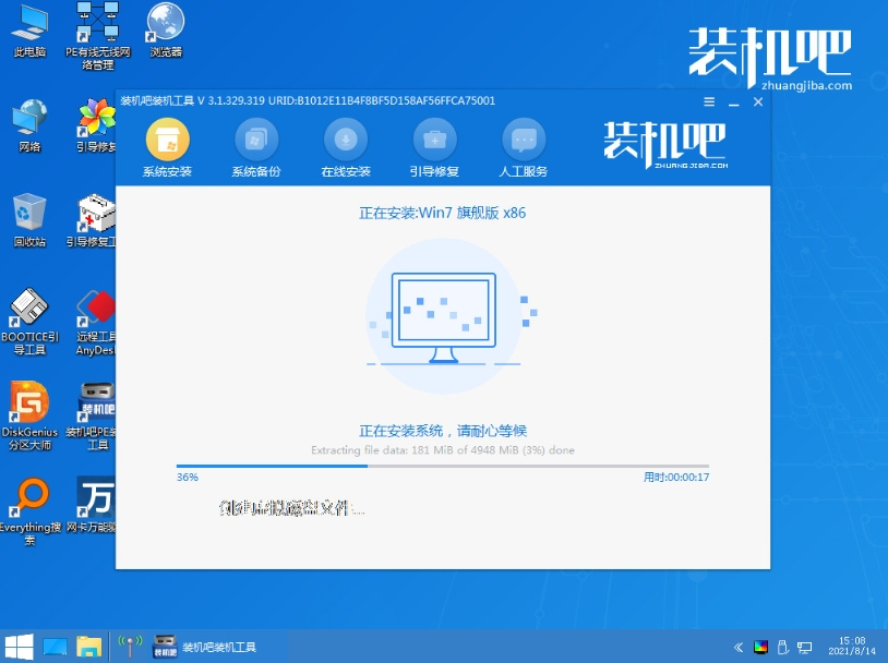 5、在pe系统桌面打开装机吧装机工具,选择需要安装的系统点击安装到c盘。