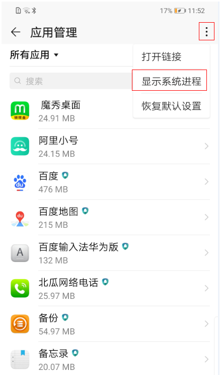 1、进入手机的设置,搜索进入应用管理,点击更多(?) > 显示系统进程。