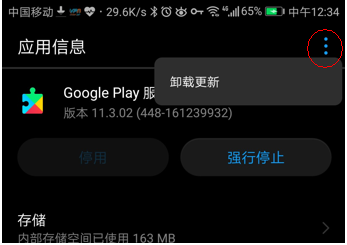 2、找到Google Play服务,点击进入后查看右上角是否存在3个点图标,选中此图标并选择卸载更新。