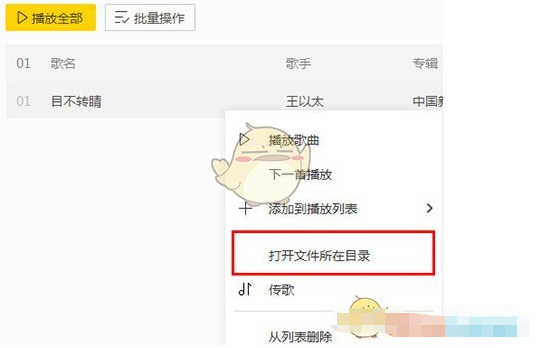4、在进入【下载情况】之后,我们就可以看到下载的所有歌曲情况。选择刚刚下载好的歌曲,鼠标右键选择歌曲,点击【打开文件所在目录】。