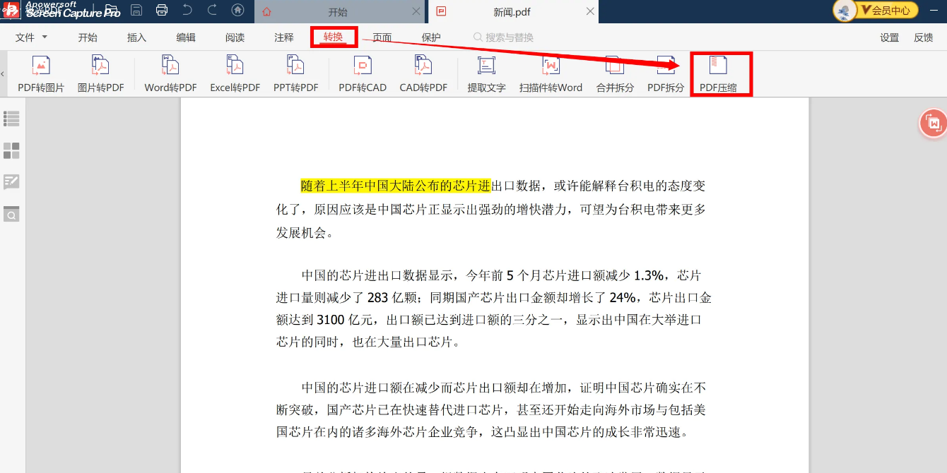 2、打开文件之后,在上方导航栏找到“转换”,点击“PDF压缩”。