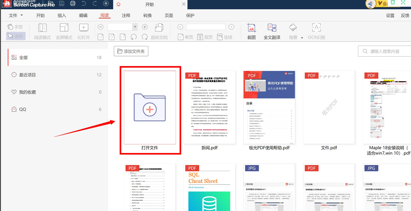 1、打开极光PDF1.71.0001之后,点击“打开文件”来打开想要压缩的文件。
