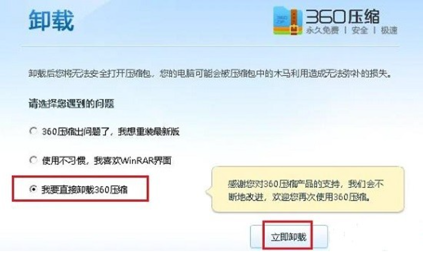 4、最后,在弹出的卸载窗口中直接选择“我要直接卸载360压缩”,点击“立即卸载”即可。