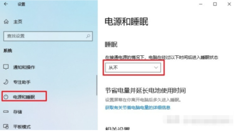电脑进入睡眠模式以后,长按笔记本电源键开机30s,通常情况下都能唤醒电脑。为了避免笔记本长时间待机系统睡死过去,我们可以打开“windows设置”-“系统”-“电源与睡眠”,设置“从不”进入睡眠。