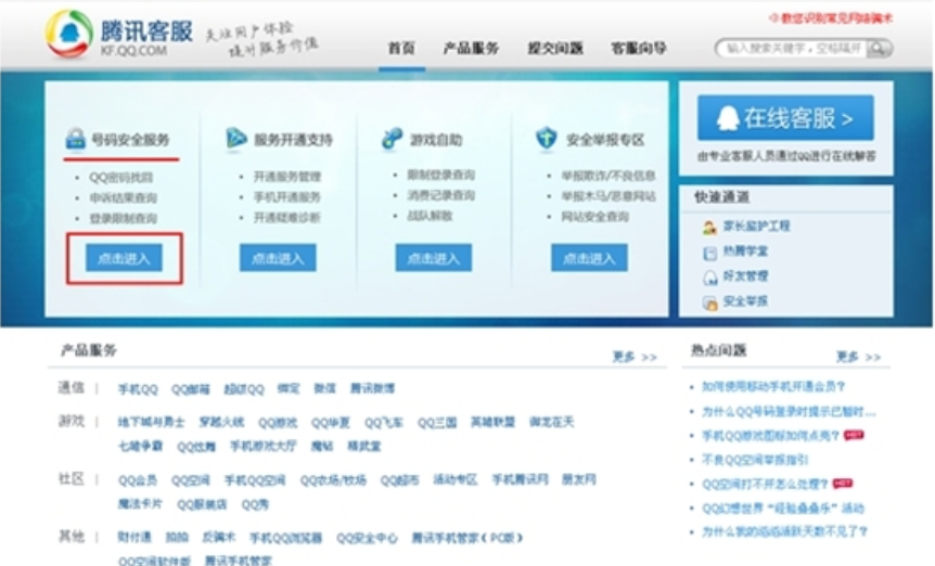 1、进入腾讯客服官网kf.qq.com,点击进入号码安全服务专区;