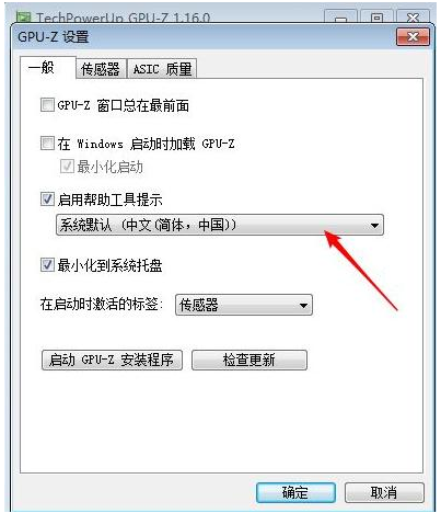 6、另外在gpu-z设置里面可以将帮助工具提示设置成中文,也可以设置成其它语言。