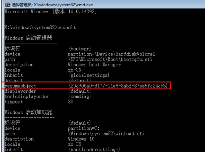 4、进入管理员窗口界面,输入【bcdedit】命令,找到名为【resumeobject】的选项,并记录随后的长字符串(就是GUID)。