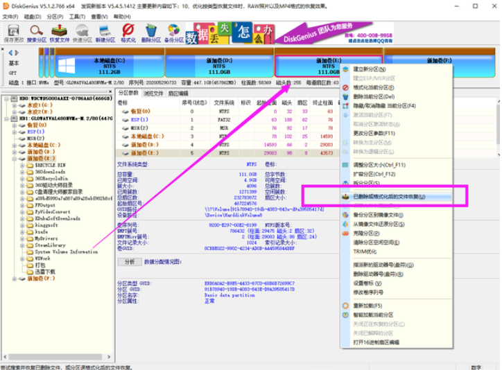 不同于数据恢复精灵,这款软件的数据恢复界面,不是向导式的。可能是因为DiskGenius除了数据恢复功能以外,还有磁盘分区管理等其他丰富实用的功能,打开DiskGenius之后,左边就是电脑各个硬盘了,选择其中的一个鼠标右击,找到下图所示功能即可进行恢复。