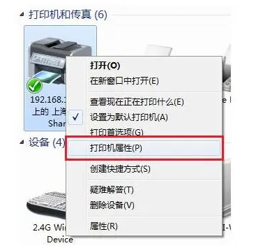 5、在打印机图标上我们鼠标右键点击,选择打印机属性。