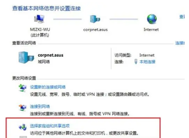 1、首先在任务栏的搜索框中输入网络和共享中心,鼠标点击选择家庭组和共享选项进入。