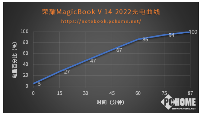 9.充电方面,荣耀MagicBook V 14 2022标配体积小巧的100W(集显机型为65瓦)双头USB Type-C充电器。充电曲线显示,前30分钟内即可从5%充到47%,一个小时内就可以充到86%,后程进入涓流充电阶段,全部充满仅用时87分钟。