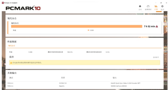 6.电池续航方面,荣耀 MagicBook V 14 2022内置60Wh容量电池,是采用PCMark 10的现代办公场景,在电量100%、平衡模式(Windows 11 21H2)、屏幕亮度60%、在开启WiFi与蓝牙的设定下开始测试。