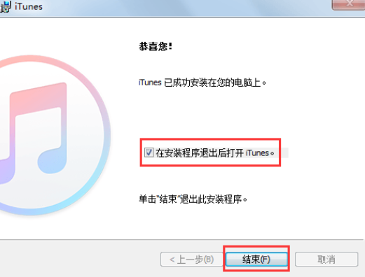 4、完成安装后,我们可以取消默认勾选“在安装程序退出后打开iTunes”,然后点击【结束】完成安装。