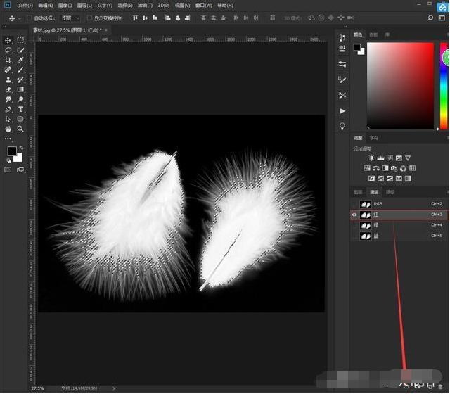 3、选择通道面板—红通道—按住Ctrl键点击缩览图载入选区(或者直接点击载入选区图标) 。知识点:通道中白色为选区。