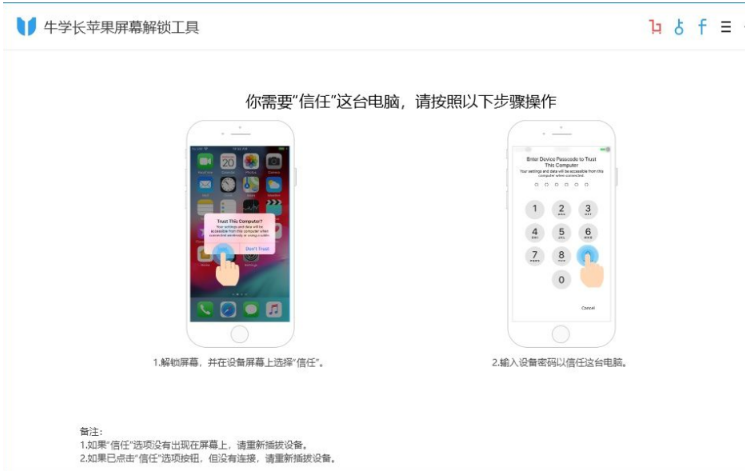 (2)使用数据线连接设备和电脑,软件将会提醒先解锁屏幕,点击设备上的“信任”。软件识别成功之后,点击“开始移除”。