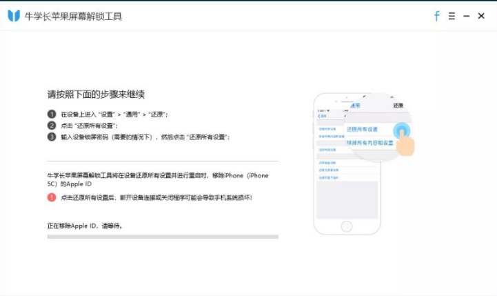 (4)“查找我的iPhone”已启用。如果启用了“查找我的iPhone”的话,就必须先重置iOS设备上的所有设置:转到【设置】-【通用】-【还原】-【还原所有设置】,重置之后设备将会自动重启,工具将会立即开始删除apple id或iCloud帐户。