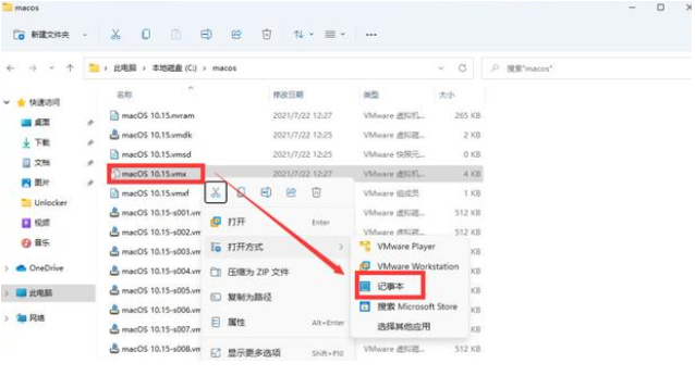 6.在系统中我们找到MacOS的安装位置,点击使用记事本打开macOS 10.15.vmx系统文件。