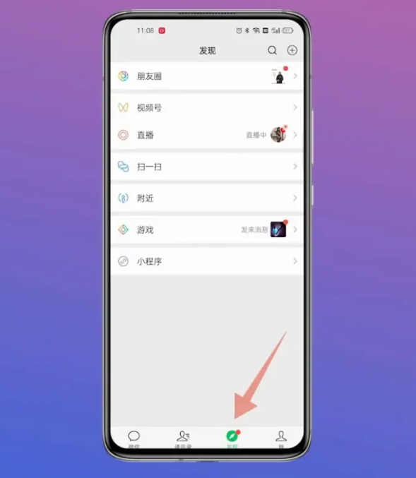 1、进入微信在微信主页下方的导航栏找到发现功能并点击。