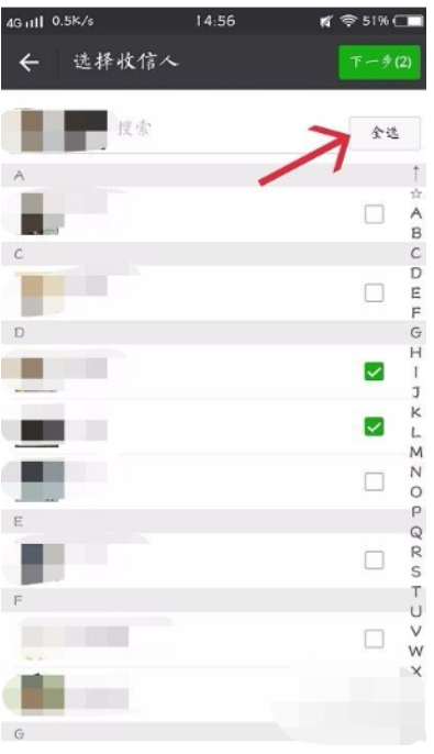 6、选择要群发消息的好友,如果要发送给所有人,就点击上方的全选(如下图),点击下一步。