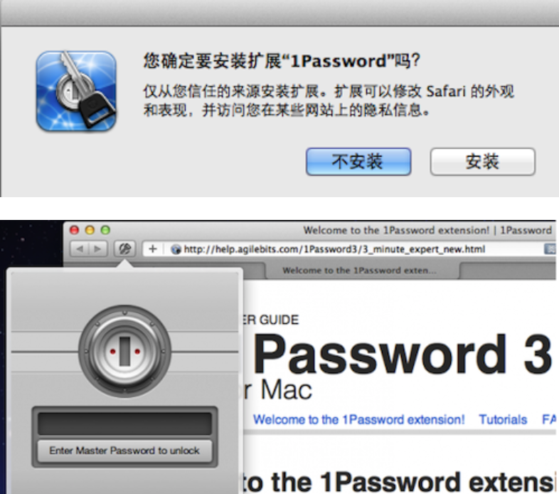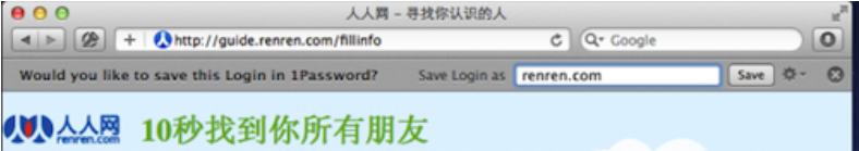 使用 1Password 非常非常简单,你在配置好 1Password 之后首次登陆其他网站时,1Password 会在浏览器顶部弹出消息,询问你是否要记住该网站的登陆信息,直接点 Save 并输入主密码,该网站的登陆信息就保存到1Password数据文件中了,在下次登陆该网站的时候,你就没有必要再手动输入用户名和密码,直接点击浏览器工具栏上的 1Password 图标(或者按快捷键command+/),然后 1Password 就会自动帮你填好用户名和密码并登陆。