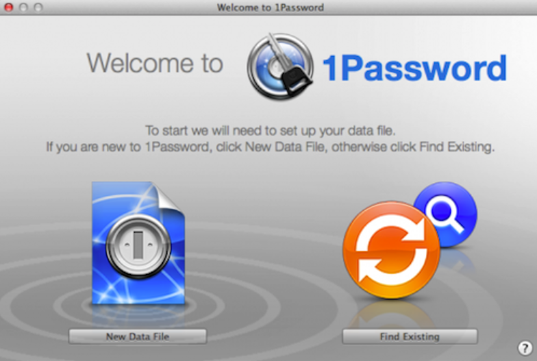 初次运行 1Password 的界面如上图所示,如果你之前没有使用过 1Password,应该直接选择”New Data File(新建数据文件)”,以后你的密码数据都会保存在这个数据文件里面。如果你之前有使用过 1Password 并且已经保存了数据,那么就应该选择”Find Existing(查找已有文件)”,这里我们只是向新用户介绍如何使用。