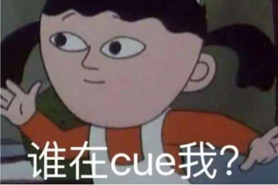 cue原意是“线索”或者“被暗示”的含义,但是作为网络用语来说,cue就是被叫到,但是不局限于被别人口头叫到,还有网络上的评论或者博文中被提到,或者是别人的一个眼神、动作,导致你觉得是在提醒或者提示你,那么也能说“你被cue到了”。
