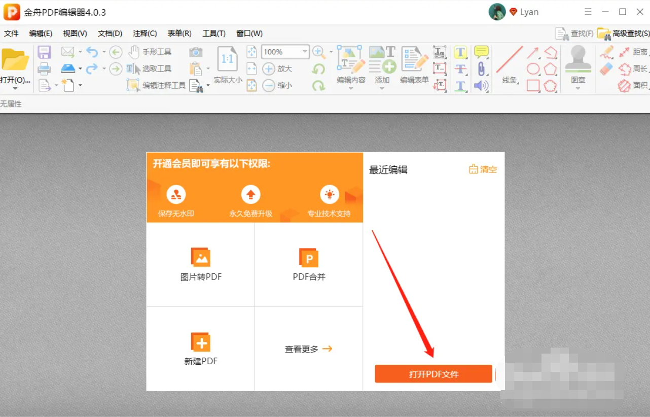 打开PDF编辑器后,点击选择“打开PDF文件”将需要处理的文件打开进行编辑;