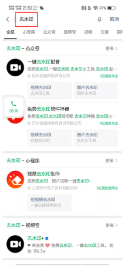 4、在搜索框的页面中,输入去水印,找到一款想要的去水印工具进行使用,这里小编用一键去水印配音工具。