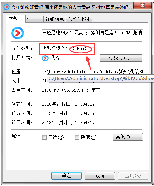 2、下载的视频属性,在常规属性界面中,大家将会发现文件的类型是kux格式。