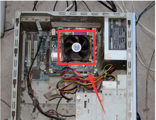 1,打开电脑机箱,找到cpu风扇,如图
