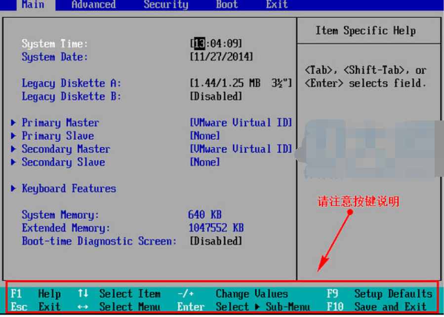 1.进入bios界面设置,在该界面我们要进行几个重要的操作,所以我们要了解界面底部注明:键盘上的方向键进行光标移动;回车键表示“确定”;F10表示“保存并退出”: