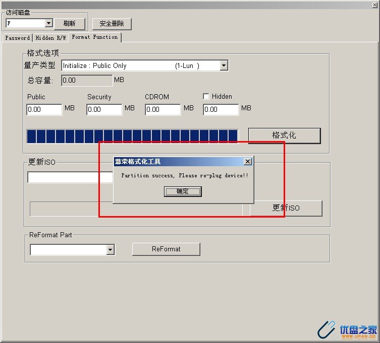 从上图来看,这个工具功能还真的很多的。OK,看到了吧。说格式化成功了,我是不是要高兴了呢。。关闭工具,重新拔插U盘,汗!问题依然,还是打不开U盘。