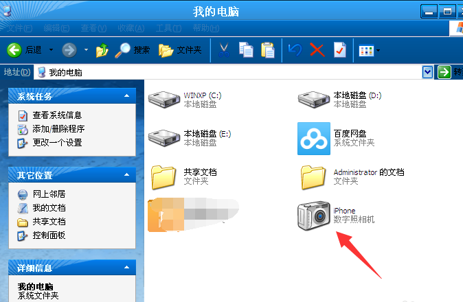 1、首先将苹果手机数据线连在电脑上,打开【我的电脑】在里面就自动显示检测到iPhone。