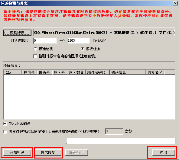3.接着可直接点击“开始检测”对硬盘进行坏道检测,等检测完毕后若没有发现硬盘坏道存在可以点击“退出”关闭程序,若有检测出硬盘坏道时,则可以按下“尝试修复”按钮对所检测出来的硬盘坏道进行修复,我们只需耐心等待修复过程结束即可点击“退出”,最后重启电脑。