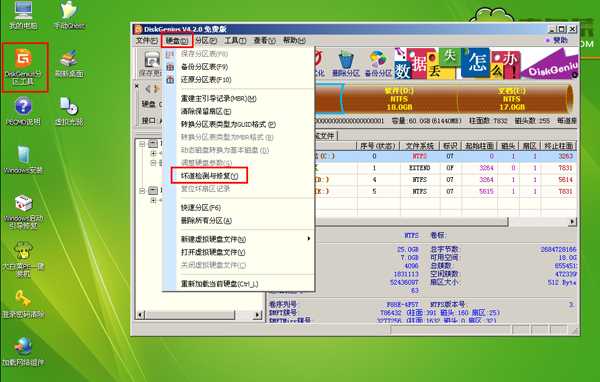 2.双击打开桌面上的“DiskGenius分区工具”,选中“硬盘”并点击“坏道检测与修复”