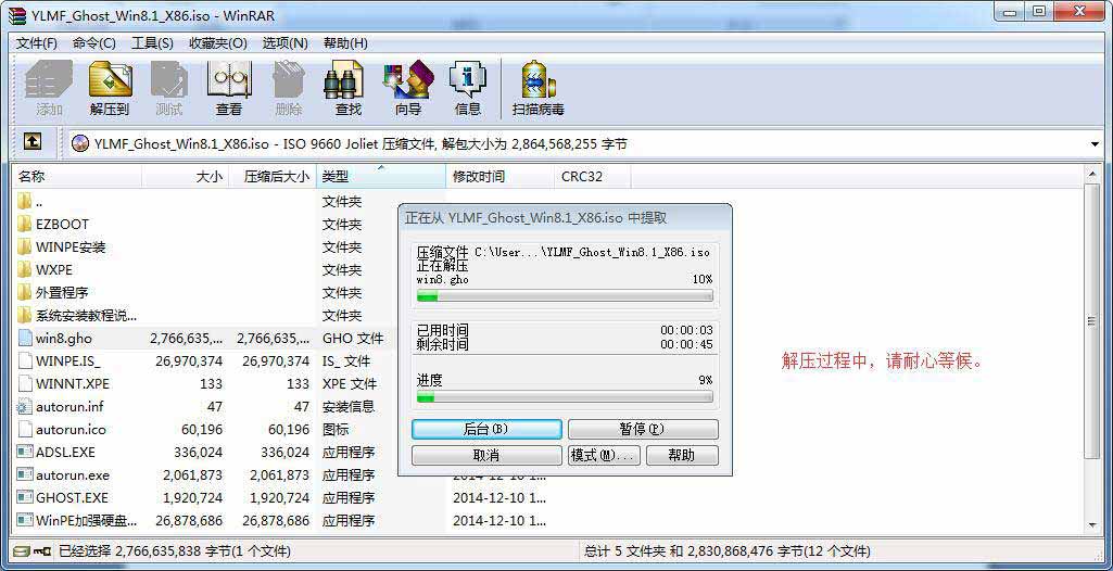 6、接下来会出现一个正在解压GHO的窗口,该窗口有进度条,此时我们无需做任何操作,只需耐心等待其完成即可,如下图所示:
