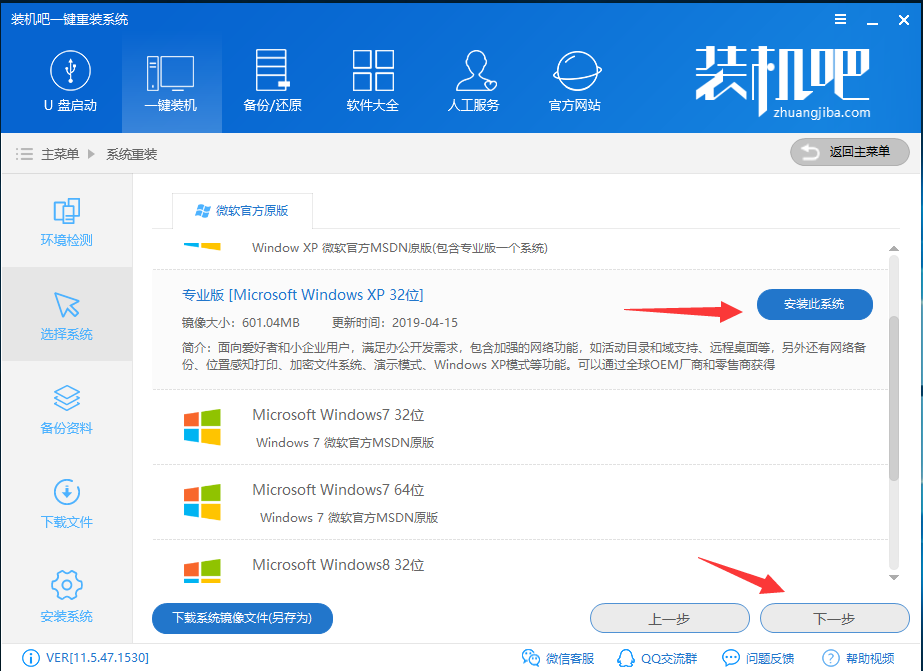 3.在出现的选择系统界面中点击xp系统,这时xp系统的右侧会出现一个安装此系统的按钮,点击该按钮,进入下一步。
