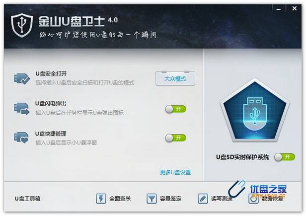 金山u盘卫士独立版,U盘工具是一个移动介质,存储量分等级有512M、1G、2G、4G、8G甚至更多,512最小,它最大的优点在于可以随身携带,4G到以下的小巧,8G的有一板老式巧克力那么大,它只要到计算机上就可以随时存储你想要的任何文件,8G则需要通过数据线连接到计算机上,容量越大存储的越多,那哪一种的U盘比较好呢?下面就让我们来看看吧。