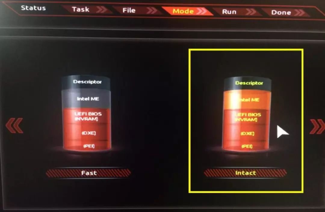 Fast为快速刷新,不更新CPU微码;Intact为完整刷新,优先选这个模式。