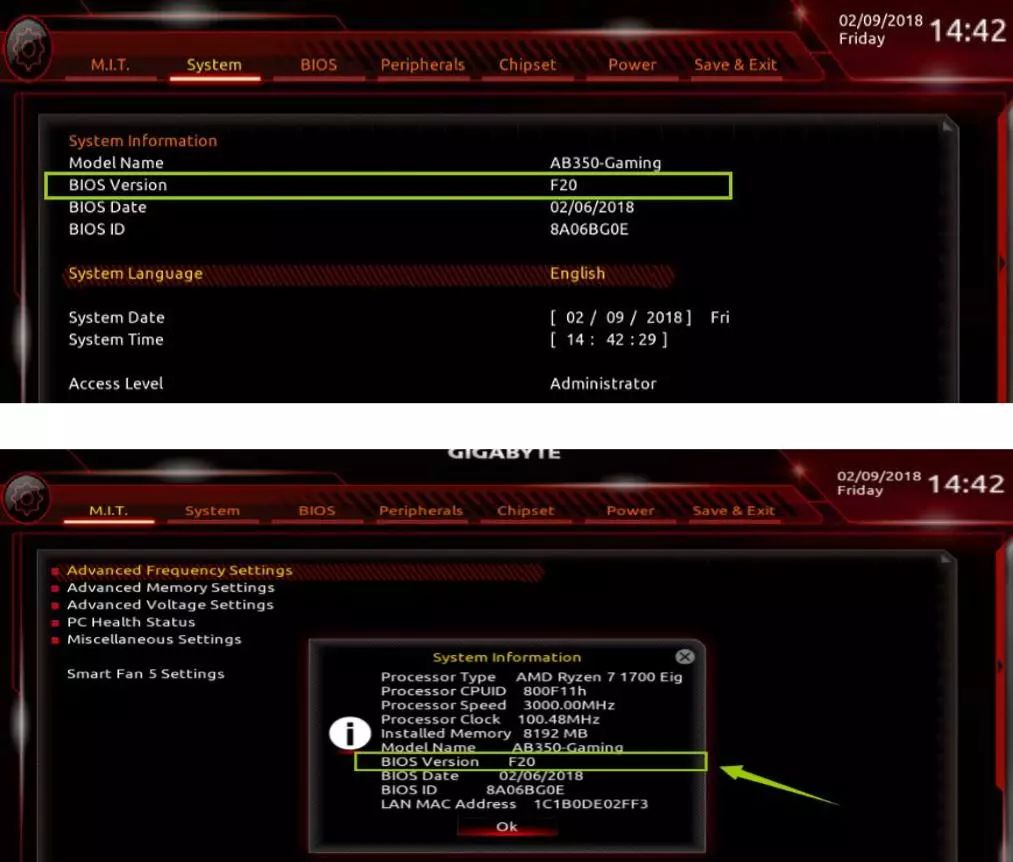 左侧上面为主板当前的版本信息,下面为更新的F20 BIOS版本