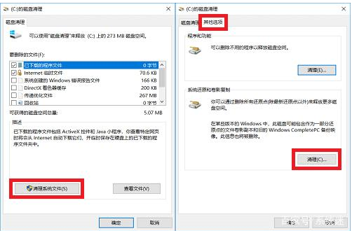 3、不过,大家可能没注意到,磁盘清理旁边还有一个“其他选项”,我们可以在里面清理“系统还原和卷影复制”,我们点“清理”,再选择“删除”即可。